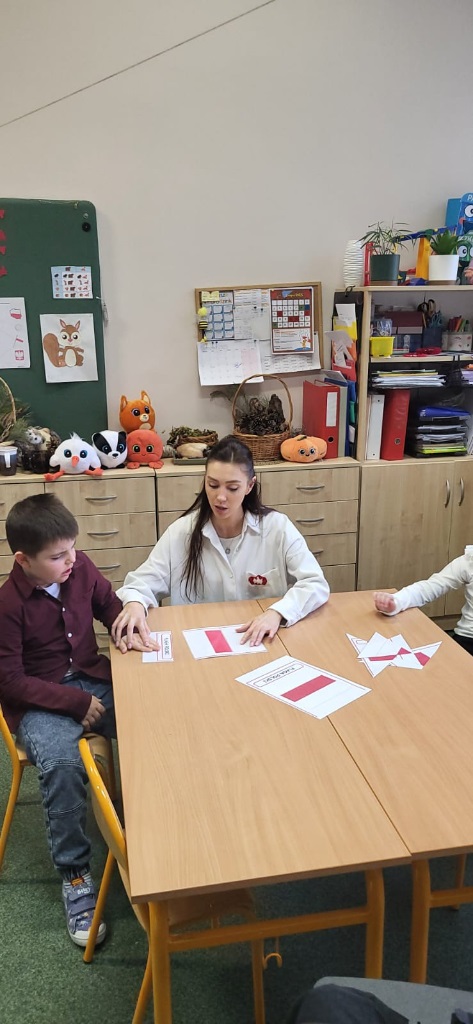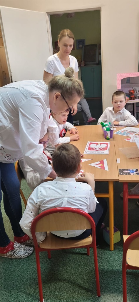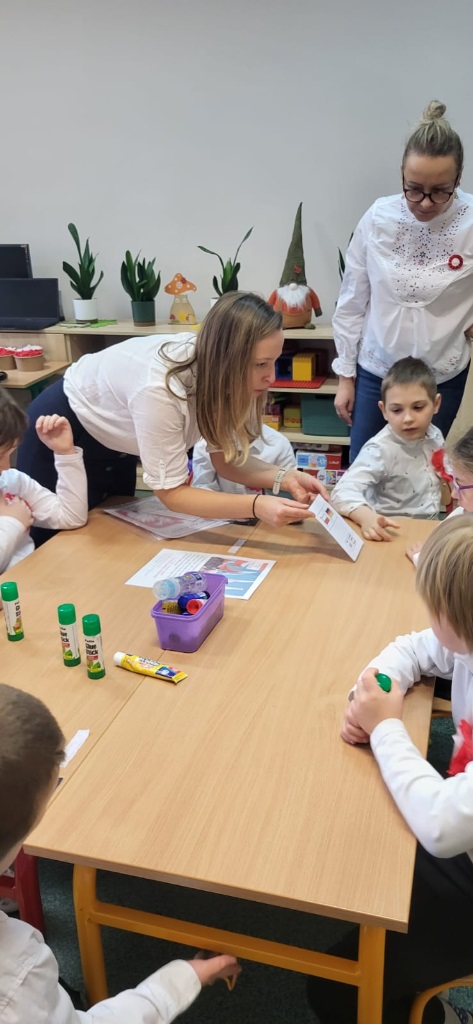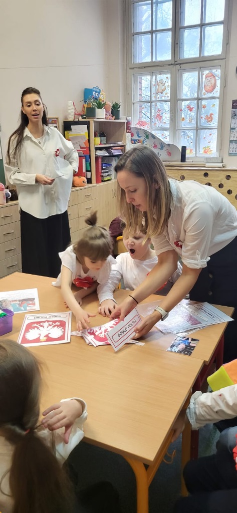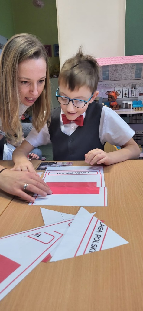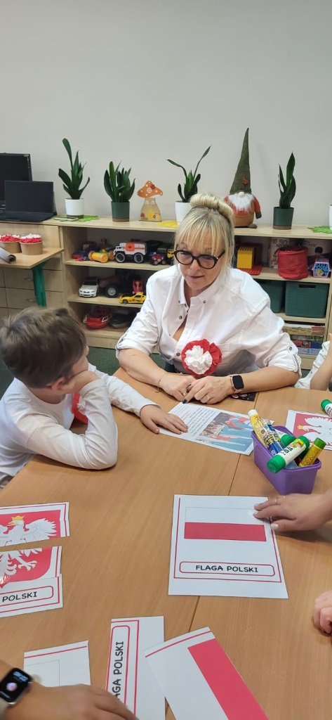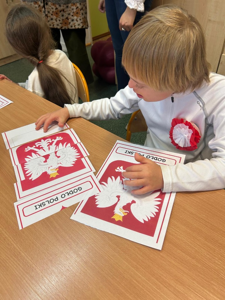 Podczas zajęć przedszkolaki utrwalały znajomość symboli narodowych, rozpoznawały godło, flagę i hymn, a także układały puzzle z motywami narodowymi, a na zakończenie wspólnie wykonaliśmy dwie piękne flagi Polski, które ozdobiły nasze sale 🇵🇱🎨