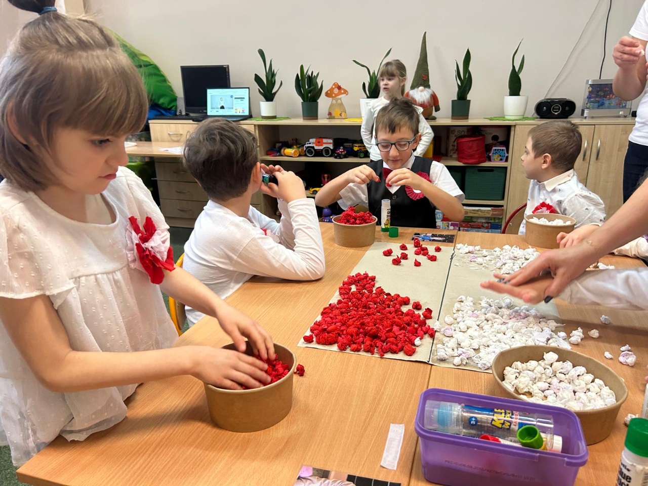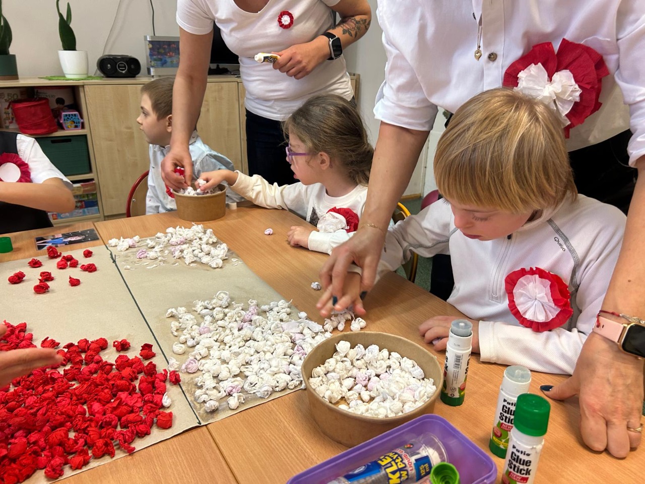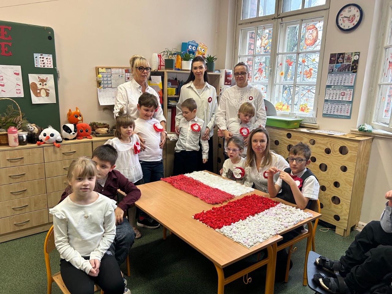 Podczas zajęć przedszkolaki utrwalały znajomość symboli narodowych, rozpoznawały godło, flagę i hymn, a także układały puzzle z motywami narodowymi, a na zakończenie wspólnie wykonaliśmy dwie piękne flagi Polski, które ozdobiły nasze sale 🇵🇱🎨