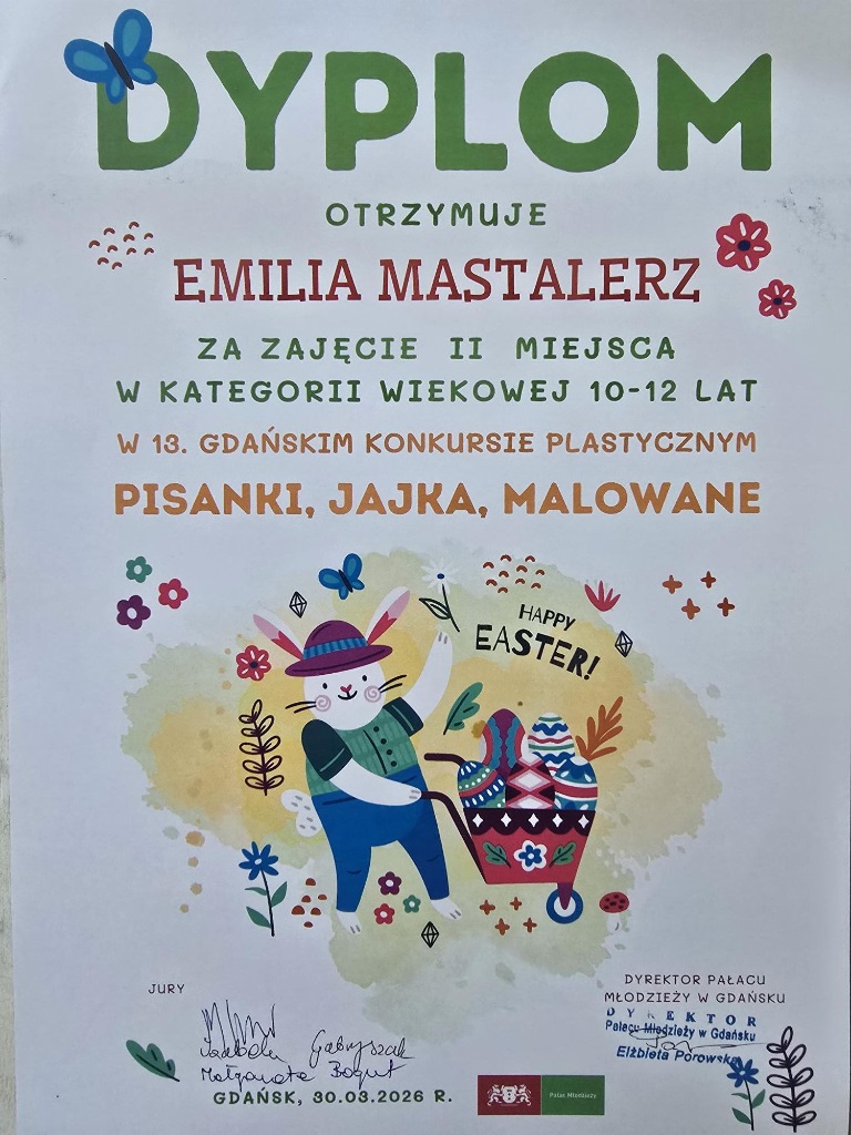 Z radością informujemy, że Emilia i Filip zdobyli zaszczytne II miejsca w 13. Gdańskim Konkursie Plastycznym „Pisanki – Jajka Malowane”.